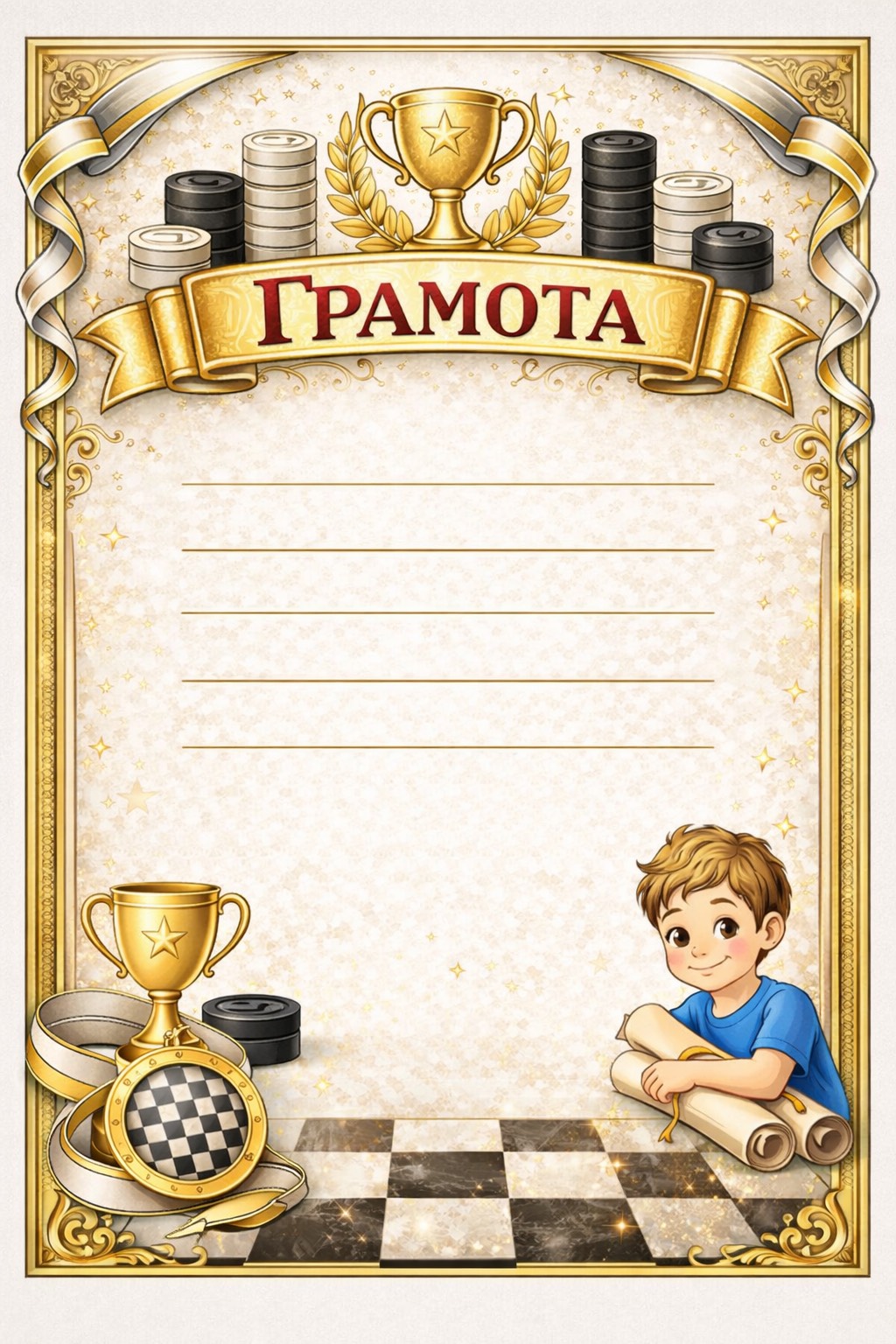 При занятиях по шашкам важно поддерживать интерес детей и отмечать их участие и достижения. Для этого удобно использовать тематические грамоты по шашкам, которые подходят для занятий, внутренних соревнований и учебных мероприятий.